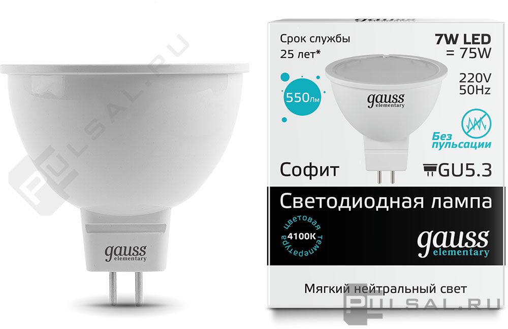 Лампа светодиодная Elementary, цоколь - GU5.3, мощность - 7Вт, световой поток - 550Лм, цветовая температура - 4100К, не диммируется, 13527, Gauss