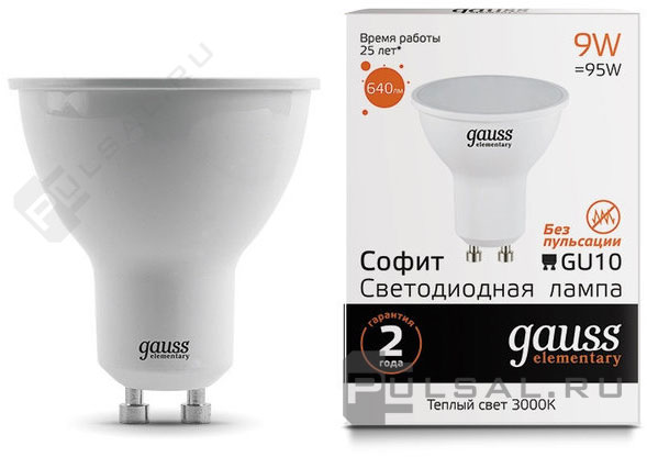Elementary, цоколь - GU10, мощность - 5.5Вт, световой поток - 430Лм, цветовая температура - 2700Кцветовая температура - 3000К, не диммируется, 13616, Gauss