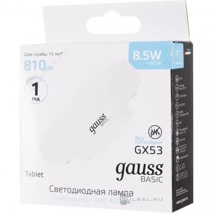Elementary, цоколь - GX53, мощность - 11Вт, световой поток - 830Лм, цветовая температура - 4100К, не диммируется, 83821, Gauss