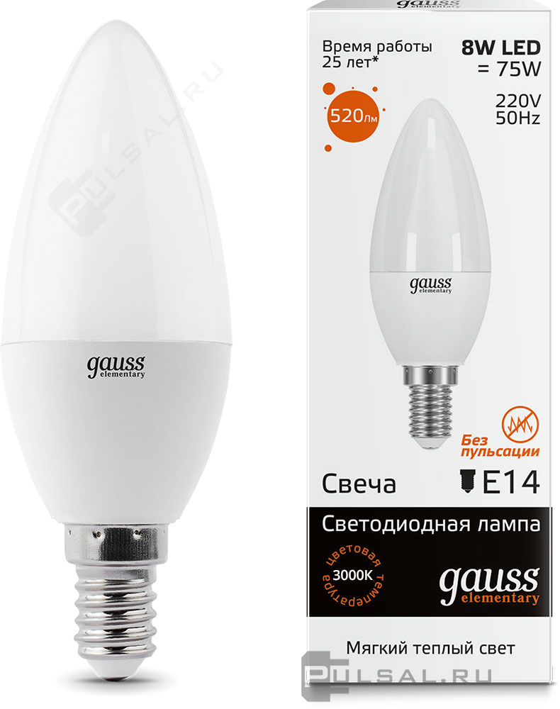 Elementary, цоколь - E14, мощность - 8Вт, световой поток - 520Лм, цветовая температура - 3000К, не диммируется, 34118, Gauss