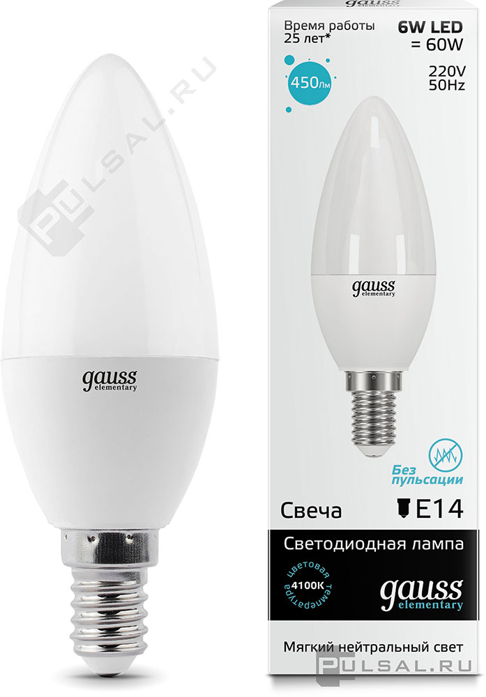Elementary, цоколь - E14, мощность - 6Вт, световой поток - 450Лм, цветовая температура - 4100К, не диммируется, 34126, Gauss