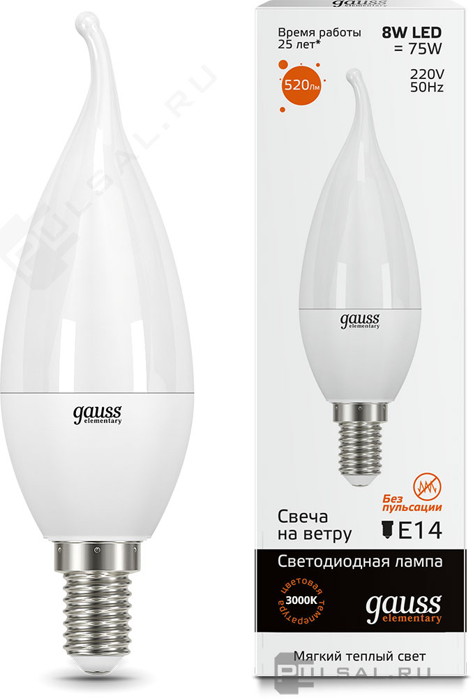 Elementary, цоколь - E14, мощность - 8Вт, световой поток - 520Лм, цветовая температура - 3000К, не диммируется, 33118, Gauss