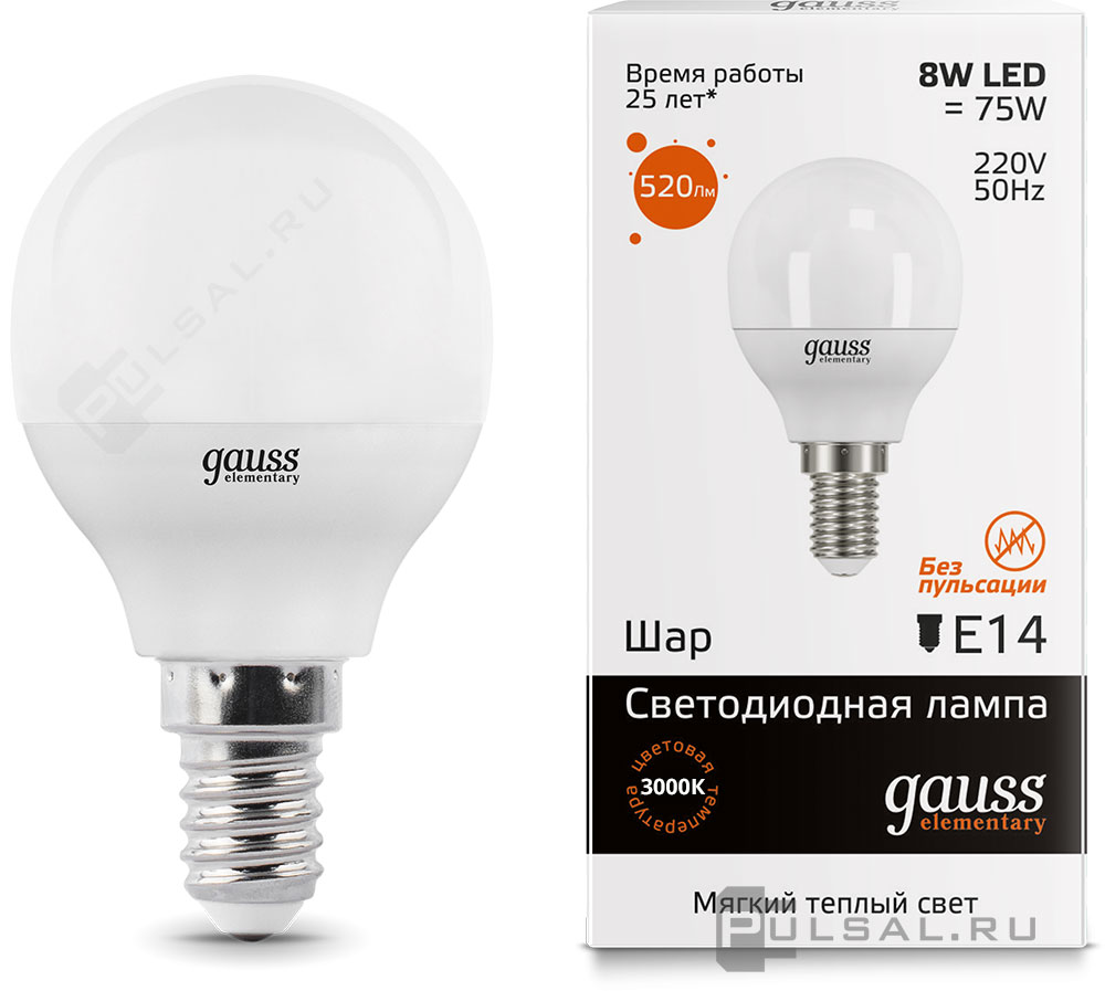 Elementary, цоколь - E14, мощность - 8Вт, световой поток - 520Лм, цветовая температура - 3000К, не диммируется, 34118, Gauss
