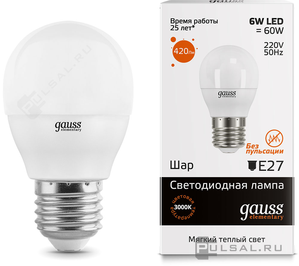 Elementary, цоколь - E27, мощность - 8Вт, световой поток - 520Лм, цветовая температура - 3000К, не диммируется, 33218, Gauss