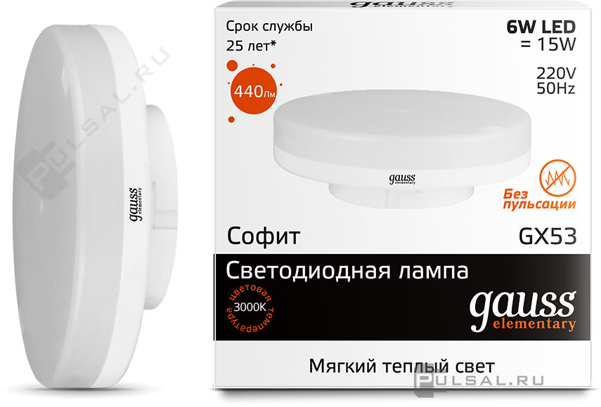 Elementary, цоколь - GX53, мощность - 13Вт, световой поток - 890Лм, цветовая температура - 3000К, не диммируется, 83813, Gauss