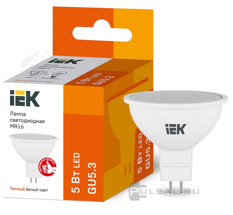 Лампа светодиодная Лампы IEK, цоколь - GU5.3, мощность - 5Вт, световой поток - 450Лм, цветовая температура - 3000К, не диммируется, LLE-MR16-5-230-30-GU5, IEK