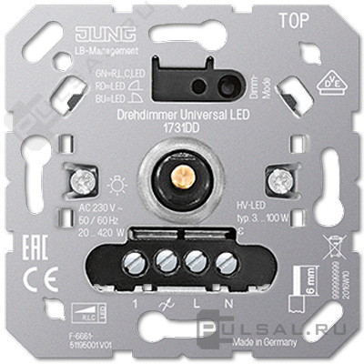Механизм светорегулятора (диммера) 20-420 Вт/ВА, для LED 3-100 Вт A VIVA, A creation, A flow, A 550, AS 500, CD 500, CD plus, LS 990, LS plus, LS 990 Les Couleurs Le Corbusier, LS ZERO, LS-design, SL 500, ECO profi и ECO profi Standart, ECO profi design (ECO Profi Deco), поворотно-нажимной, с возможностью управления с 2-х мест, лампы накаливания и галогенные 220В (R), лампы с индукционным (обмоточным) трансформ.(L), лампы с электронным (емкостным) трансформ.(C), диммируемые лампы LED 220В (LEDi тип L), диммируемые лампы LED 220В (LEDi тип C)