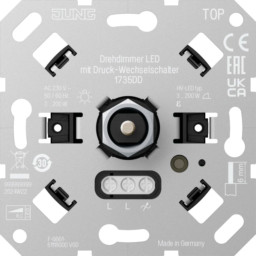 Механизм светорегулятора (диммера) 3-200 Вт, для LED 3-200 Вт/Ва A VIVA, A creation, A flow, A 550, AS 500, CD 500, LS 1912, LS 990, LS plus, LS 990 Les Couleurs Le Corbusier, LS ZERO, LS-design, SL 500, ECO profi и ECO profi Standart, ECO profi design (ECO Profi Deco), поворотно-нажимной, с возможностью управления с 2-х мест, лампы накаливания и галогенные 220В (R), лампы с электронным (емкостным) трансформ.(C), диммируемые лампы LED 220В (LEDi тип C)