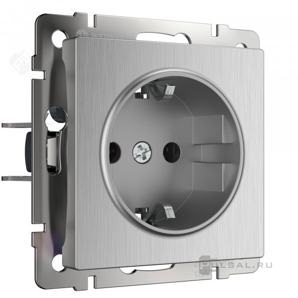 Розетка Alumax, Split, Slab, Senso, Baguette, Acrylic, Platinum, Elite, Snabb, Stream, Flock, Stark, Fiore, Favorit, Diamant, Aluminium, Antik, Metallic, со шторками, с заземлением, одинарная, винтовые клеммы, цвет - серебряный рифленый
