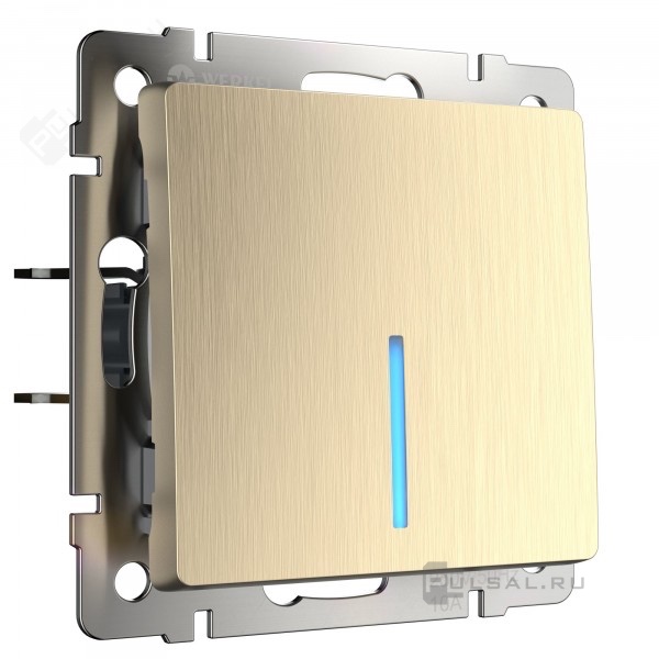 Выключатель Alumax, Split, Slab, Senso, Baguette, Acrylic, Platinum, Elite, Snabb, Stream, Flock, Stark, Fiore, Favorit, Diamant, Aluminium, Antik, Metallic, одноклавишный, с подсветкой, цвет - шампань рифленый