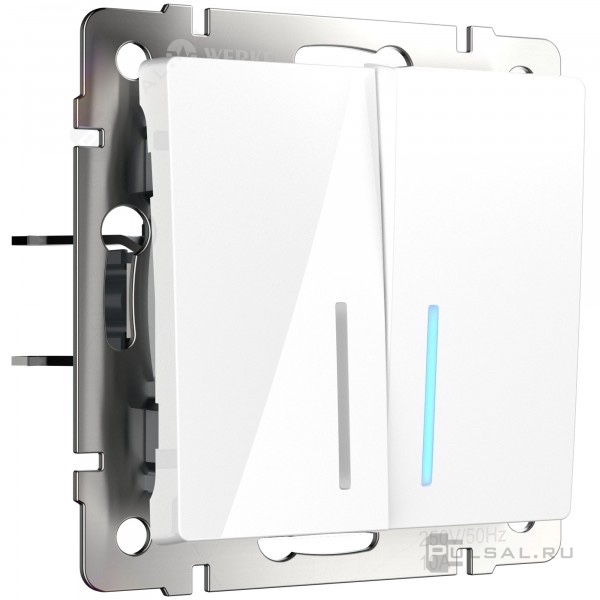 Переключатель Alumax, Split, Slab, Senso, Baguette, Acrylic, Platinum, Elite, Snabb, Stream, Flock, Stark, Fiore, Favorit, Diamant, Aluminium, Antik, Metallic, двухклавишный, с подсветкой, цвет - белый