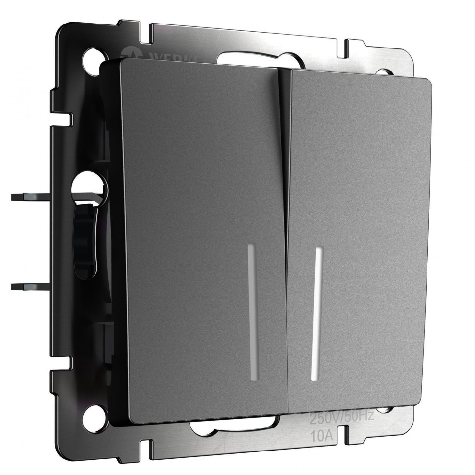 Переключатель Alumax, Split, Slab, Senso, Baguette, Acrylic, Platinum, Elite, Snabb, Stream, Flock, Stark, Fiore, Favorit, Diamant, Aluminium, Antik, Metallic, двухклавишный, с подсветкой, цвет - графит матовый