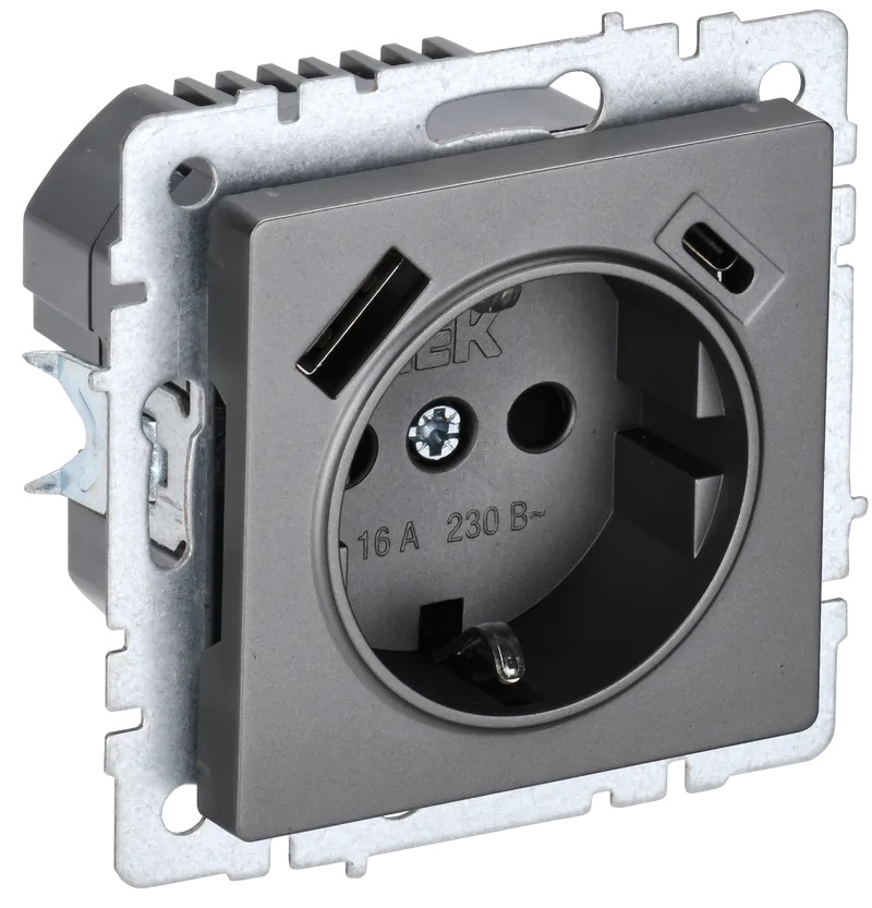 Розетка электрическая + USB А+С, быстрая, 18 Вт BRITE, USB type-C 5V, USB type-A 5V, двойная, цвет - сталь