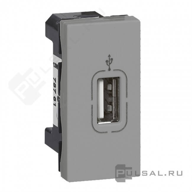 Зарядка USB type-A, 0, 75A Mosaic, DLP, DLP floor, DLP IP 44, DLP IP 40, USB type-A 5V, одинарная, цвет - алюминий