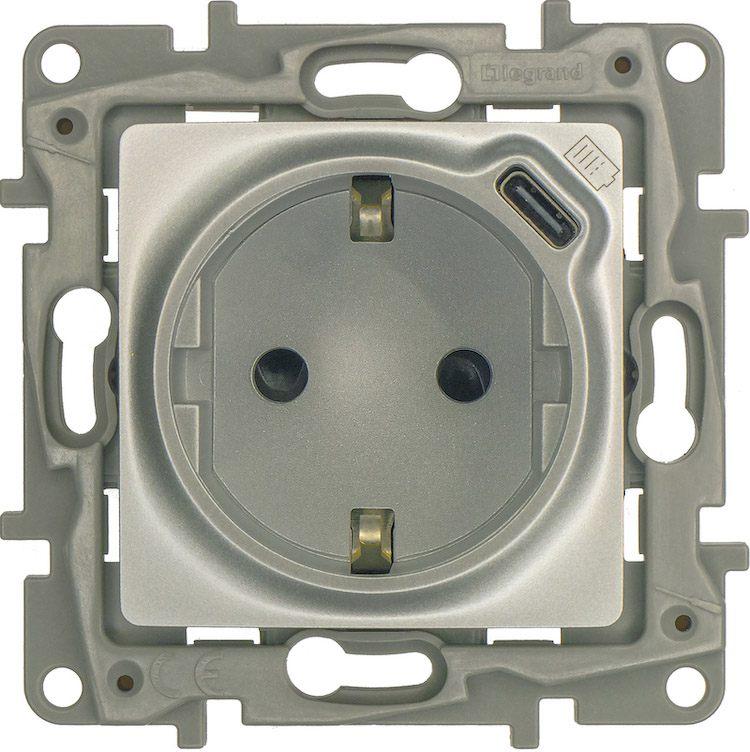 Розетка Etika, со шторками, с заземлением, одинарная, винтовые клеммы, цвет - алюминий