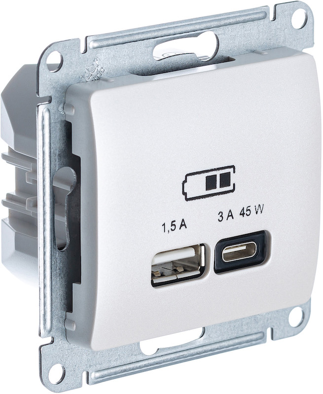 Розетка USB type-A+C 45 Вт с быстрой зарядкой Glossa, USB type-C 5V, USB type-A 5V, двойная, цвет - перламутр