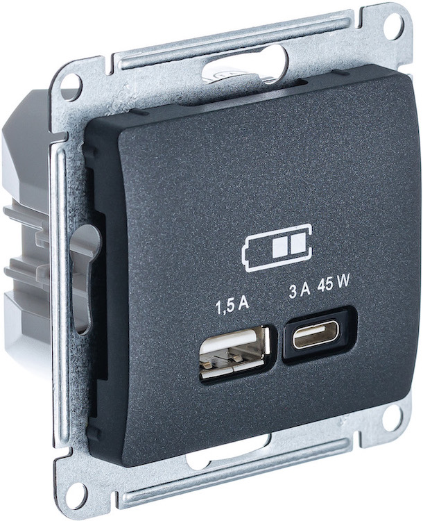 Розетка USB type-A+C 45 Вт с быстрой зарядкой Glossa, USB type-C 5V, USB type-A 5V, двойная, цвет - антрацит