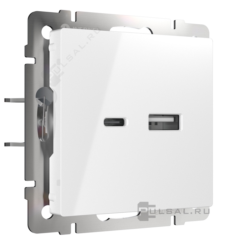 Розетка USB A+С Alumax, Slab, Senso, Baguette, Acrylic, Platinum, Elite, Snabb, Stream, Flock, Stark, Fiore, Favorit, Diamant, Aluminium, Antik, Metallic, USB type-C 5V, USB type-A 5V, двойная, цвет - белый